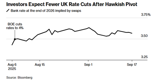 自英国央行8月会议释放鹰派信号后,投资者已下调对进一步降息的押注。